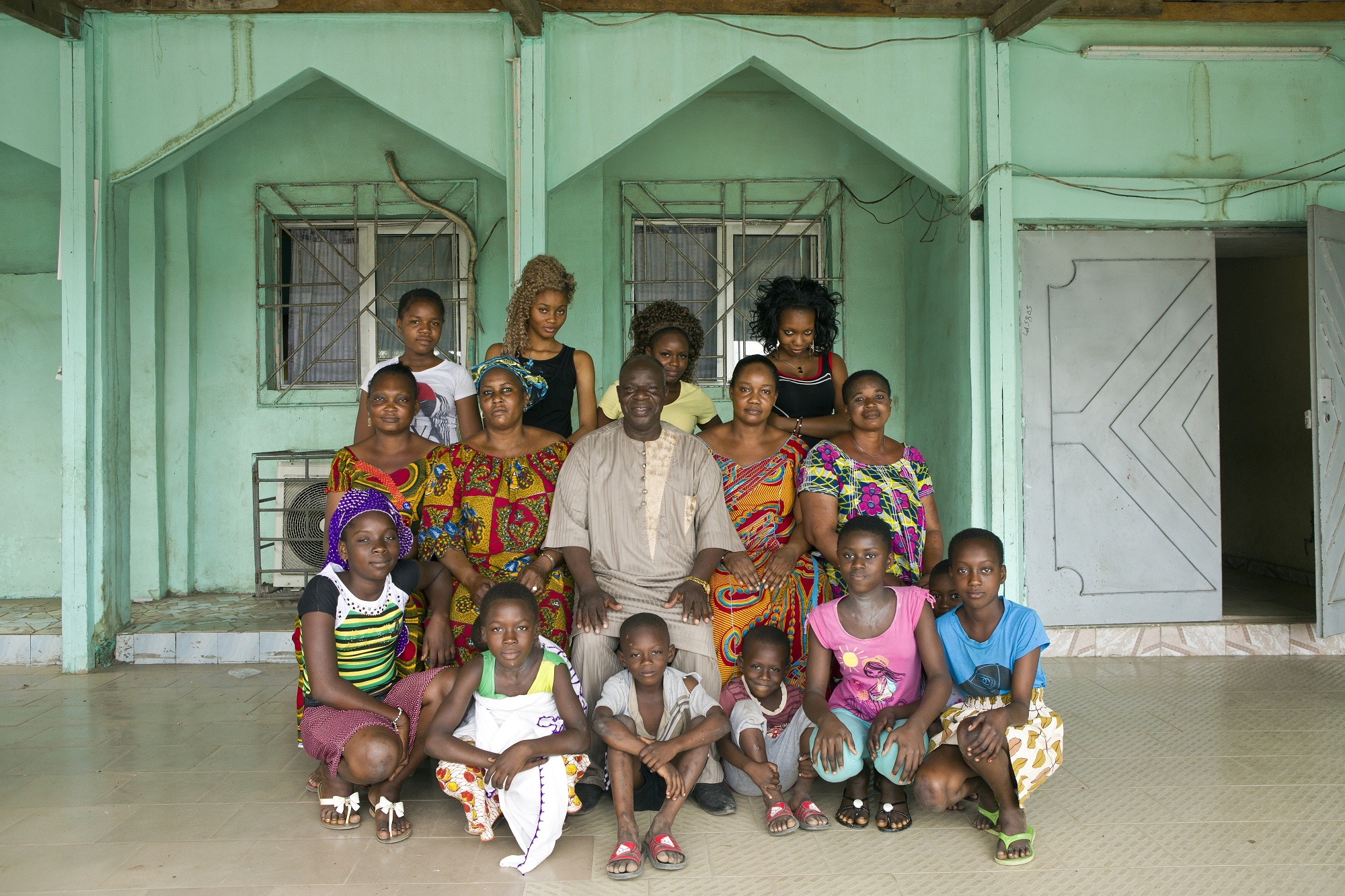 Mamadou poses with his four wives and some of his 14 children in front of their house located in Abidjan's Yopougon neighbourhood.