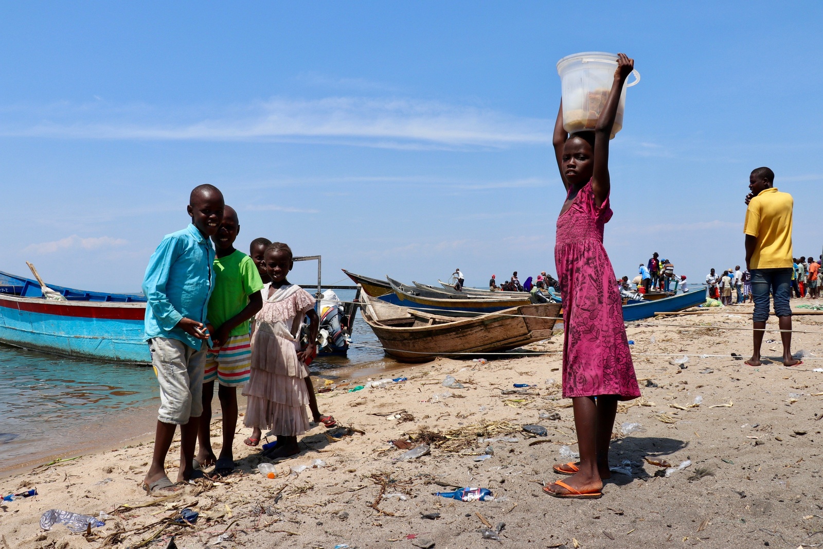 TCHOMIA, the Democratic Republic of the Congo – Fishing boats line the shore of Lake Albert in the north-eastern Democratic Republic of the Congo. Children play in the shallow water, while adults throng the busy market.