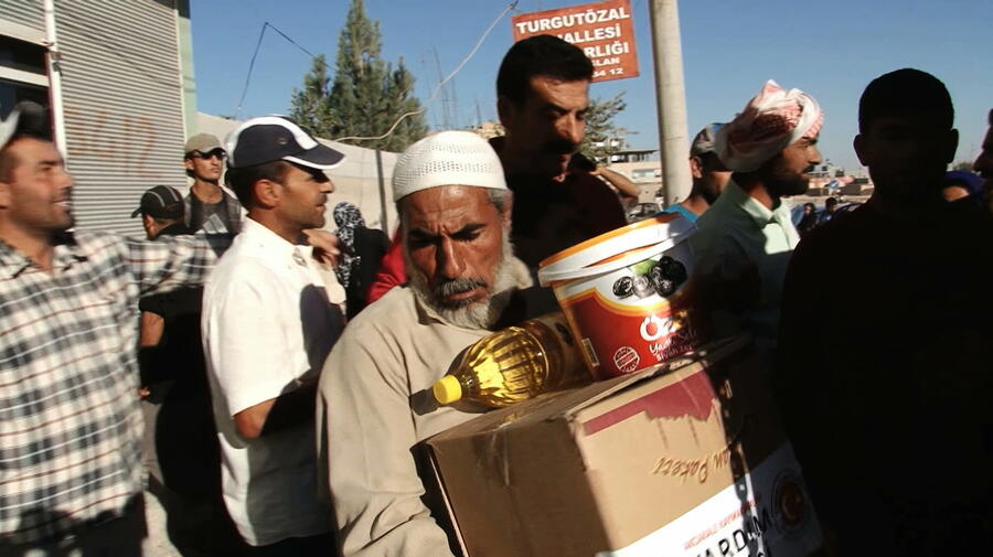 The crowd outside the office in Akcakale are waiting for a truck to arrive with relief items collected by private citizens and non-governmental organizations. Armed with a registration card, each family will be given oil, sugar and a box of basic foodstuffs.
