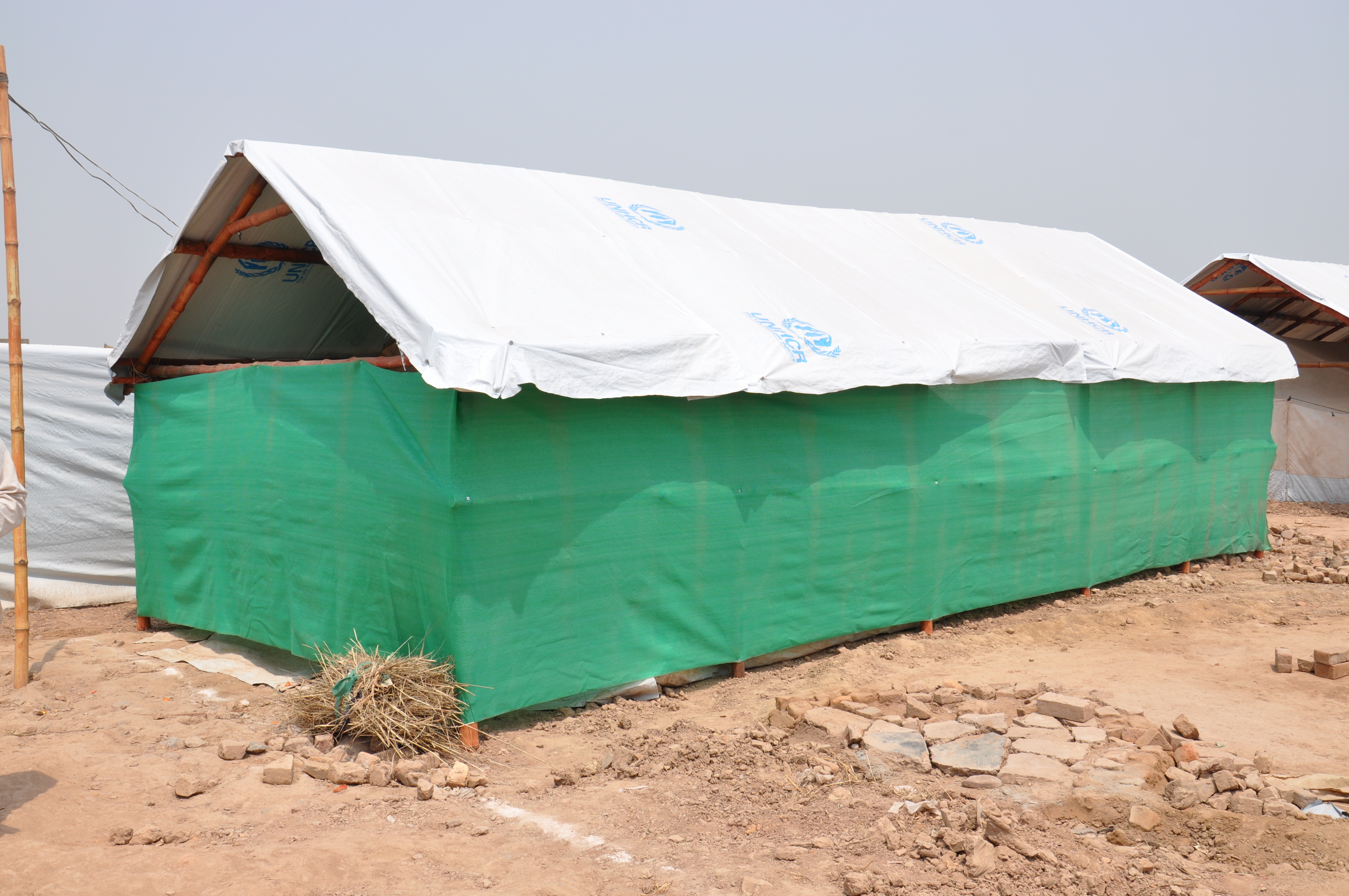 In constructing the shelters, a bamboo frame is first assembled around the family's tent. Plastic sheeting is then suspended over the roof of the frame while netting surrounds the structure to allow for air circulation while serving as a purda or privacy screen. The shelters have the added benefit of extending the family's living area.