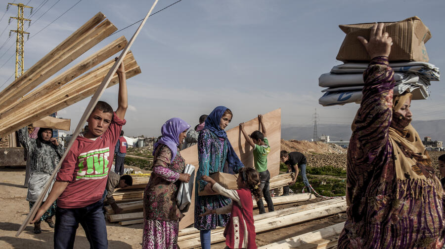 Syrian refugees at an informal settlement in Lebanon carry aid items, including wood to strengthen their shelters for winter.