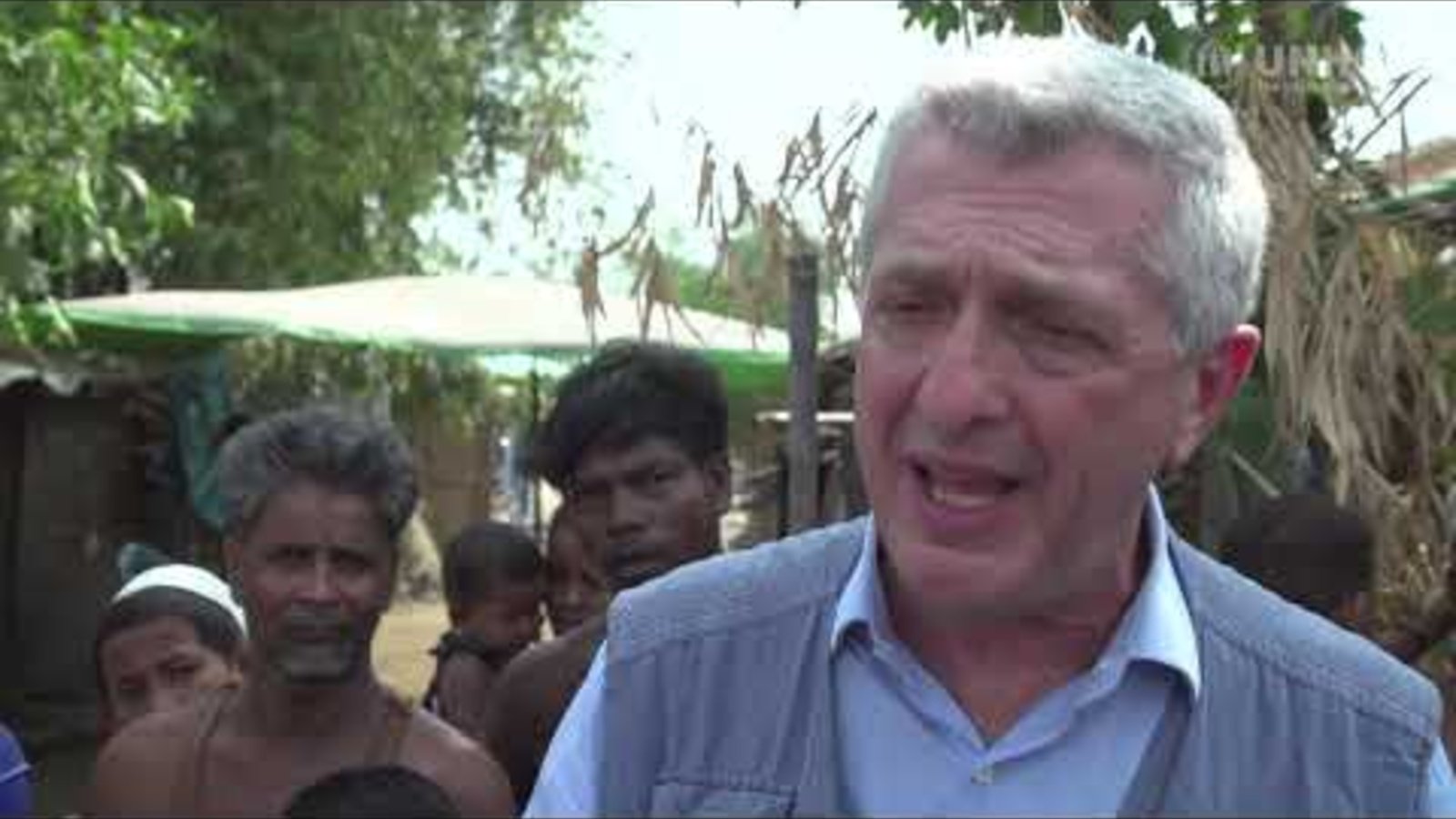 UN High Commissioner for Refugees Filippo Grandi tours a Rohingya village in Myanmar's Rakhine State with members of their community.