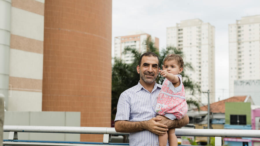 Resettled Syrian refugee Khaled poses for a portrait with his daughter, Yara, 1, in downtown Sao Paulo, Brazil.