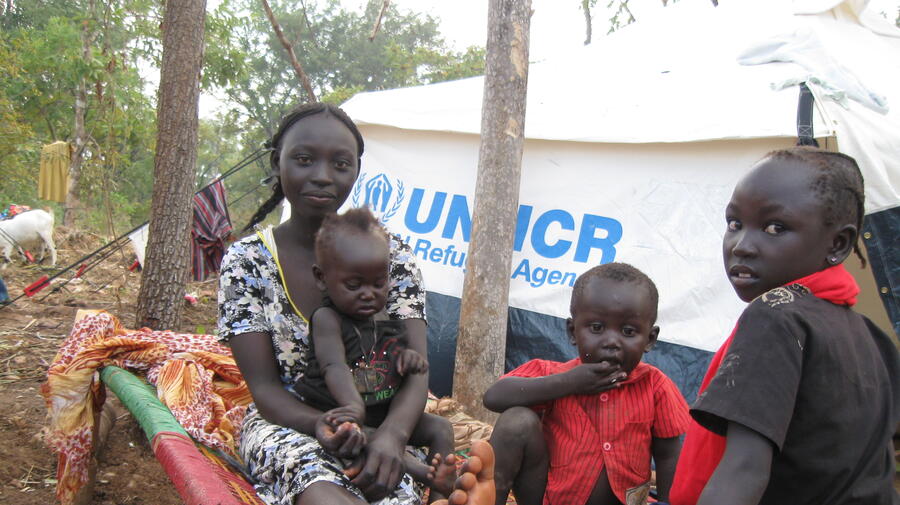 Sudanese refugees rest next to their UNHCR tent inside South Sudan.