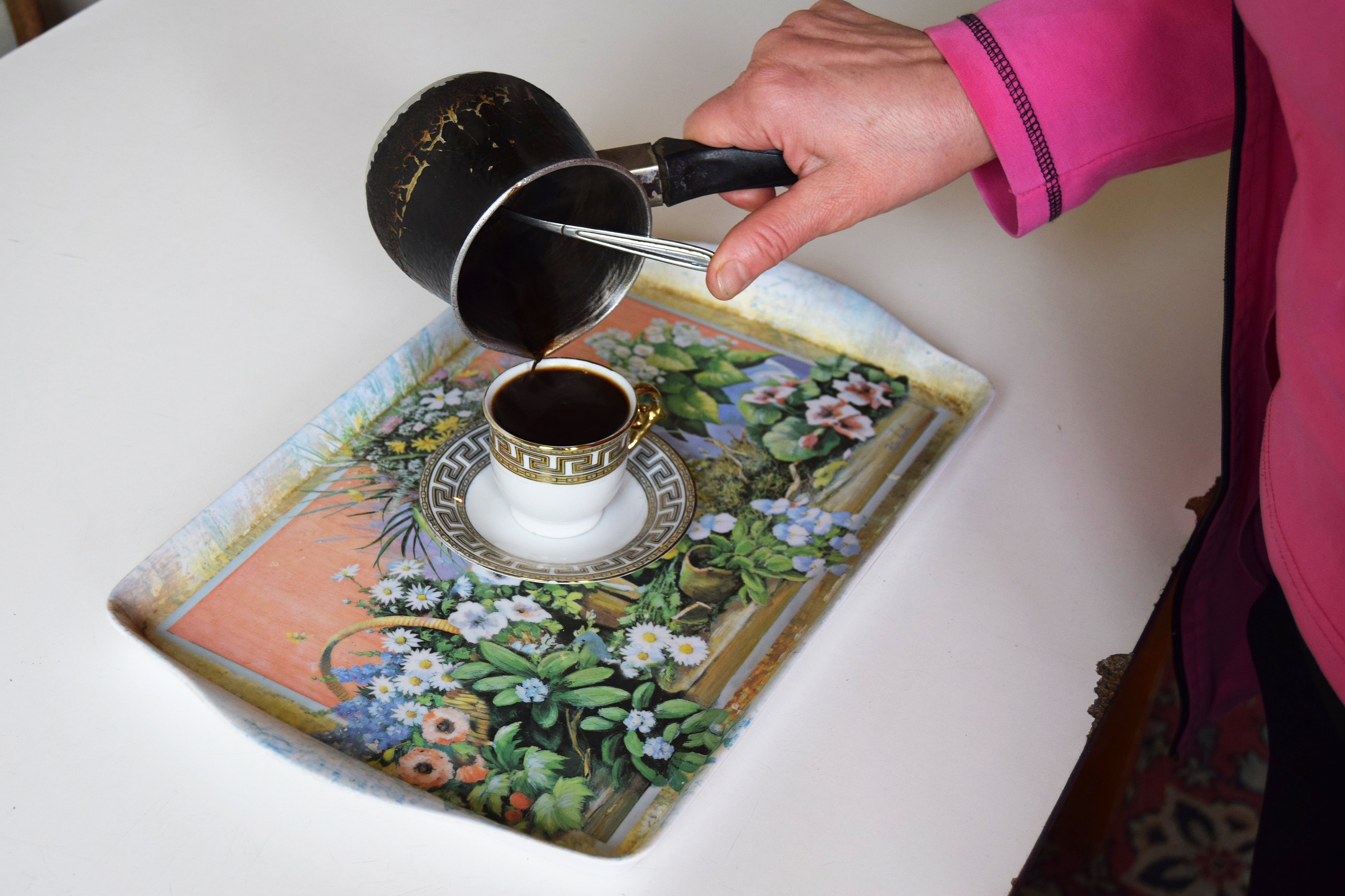 Ani, a Syrian-Armenian, pours coffee in her apartment in the Armenian capital Yerevan. Ani, her husband George and their twins fled to Armenia from Syria in 2015 but have struggled due to the COVID-19 pandemic.