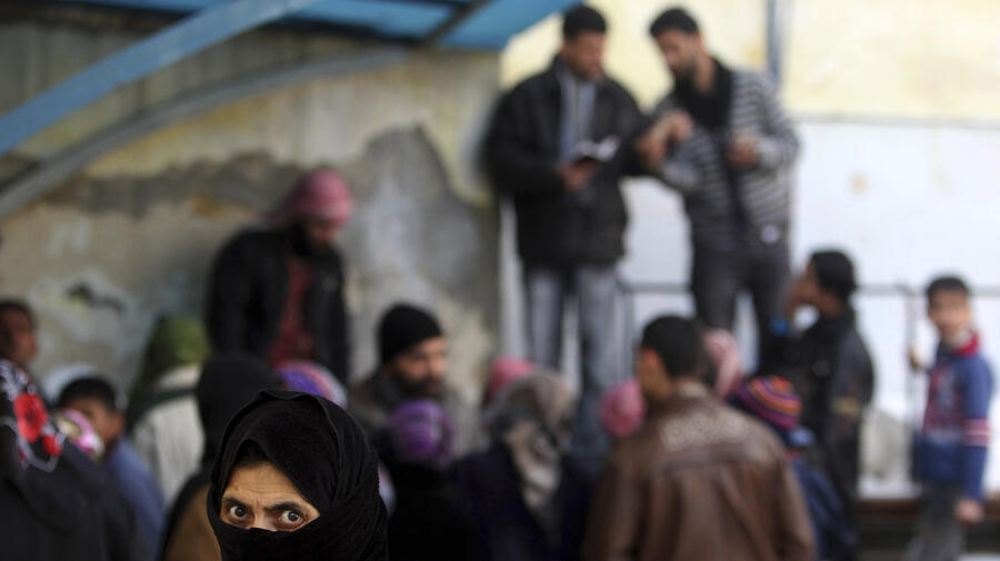 A Syrian woman stands among displaced people waiting to receive clothes in the Azzas region.