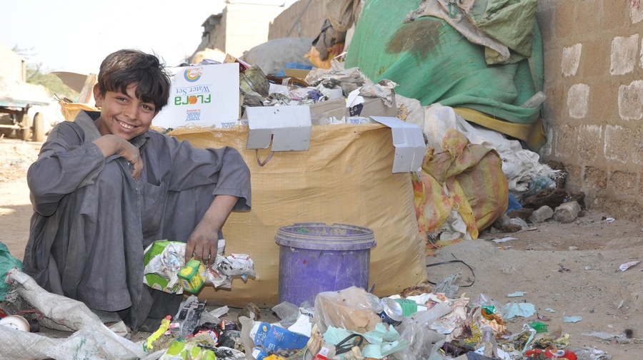 A young garbage collector squats beside a pile of rubbish at a small separating depot in Karachi.