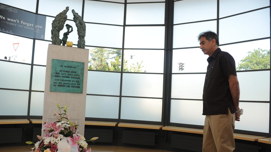 After a World Humanitarian Day ceremony at UNHCR headquarters Wednesday, UNHCR staff members individually paid respects at a memorial honouring those who gave their lives while serving refugees.