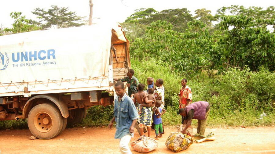 Refugees from Côte d'Ivoire board a UNHCR truck.