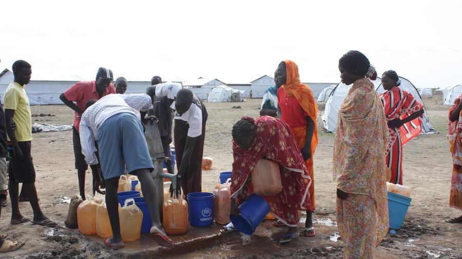 Refugees collect water at a distribution point in a settlement in South Sudan.