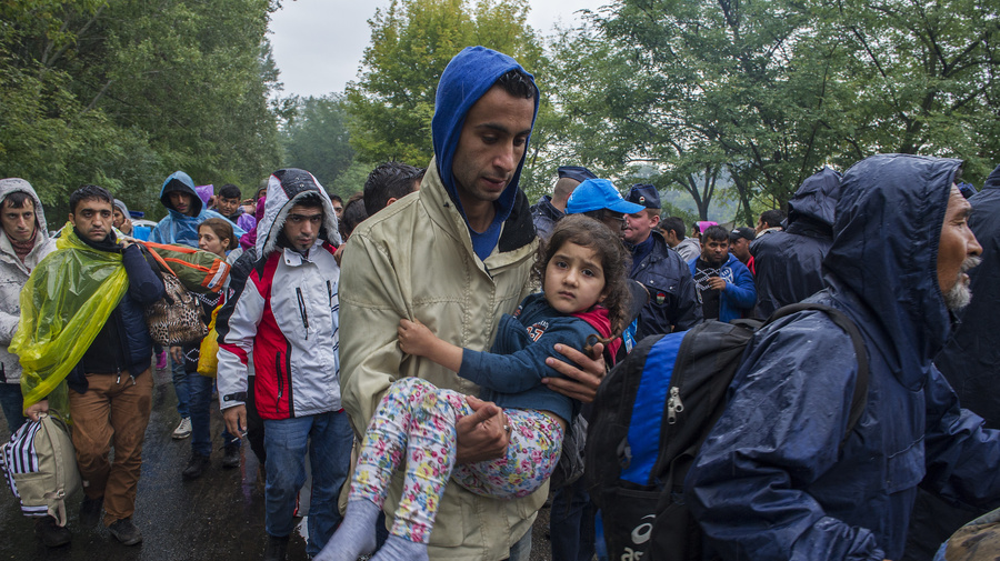 Refugee family groups, in the rain at a collection point close to the Serbian border, wait to board buses to go to the registration centre run by the Hungarian authorities.