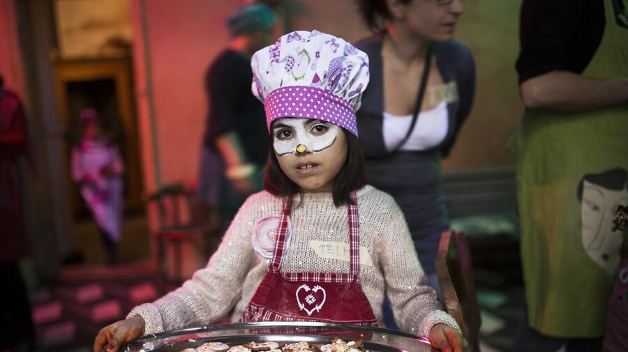 Young refugee Telma proudly displays the glazed gingerbread biscuits she has made in the Kanepes cultural centre in central Riga, Latvia.