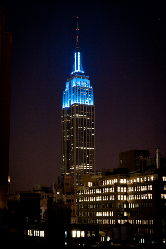 The Empire State Building bathed in blue light in honor of World Refugee Day 2011.