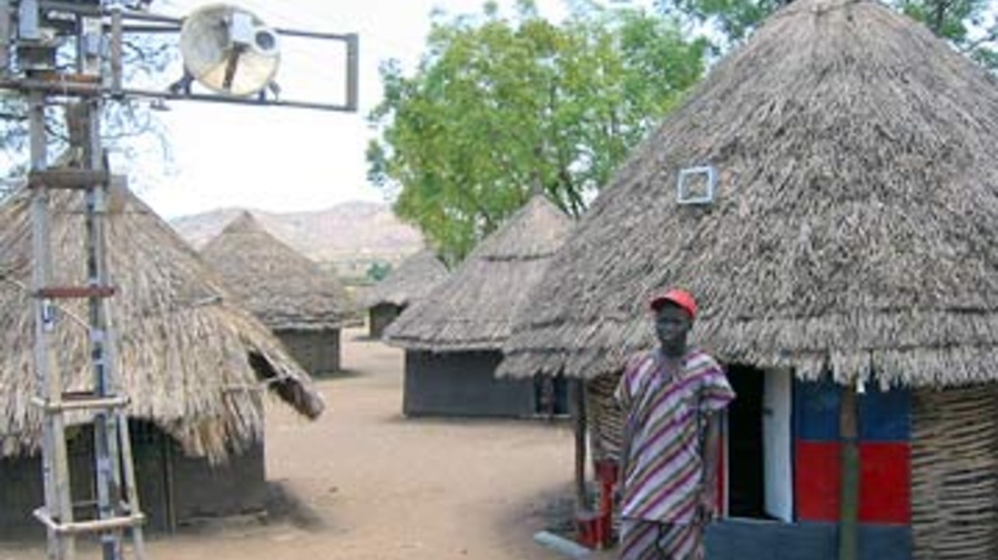 Sadik's presence stands out - a slender metal and bamboo structure bristling with wires, antenna and a home-made satellite dish for radio and TV looms over his workshop. He lives in a thatched mud hut with his wife and child. Inside, it's a treasure trove of electronic equipment and gadgets - all made by Sadik from discarded material found in the camp.