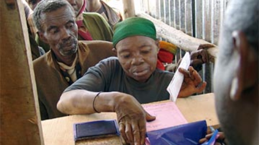 A Burundian returnee collects her UNHCR cash grant at a transit centre in Ruyigi province.