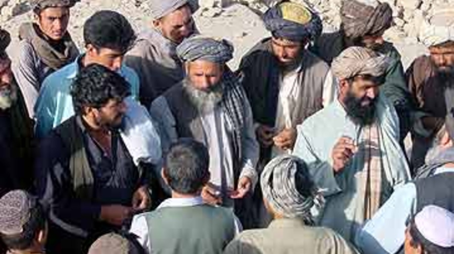 Najam Uddin (centre) representing of the people of Maqqur district in Badghis in a delegation sent to inform Afghan refugees in Pakistan's Balochistan province about conditions back home.