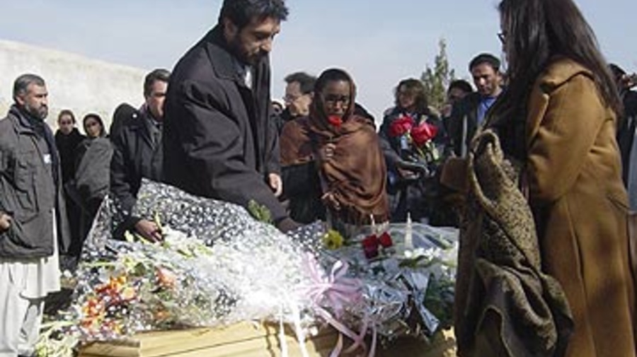The coffin, draped in a pale blue UN flag, was carried from the chapel to the British Cemetery in a white UN vehicle. The crowds of people, animals and vehicles that normally throng Kabul's streets parted as the long cortege passed. Goislard was escorted to her final resting place by Afghan police and soldiers from the International Security Assistance Force, which is helping to secure the city and Kunduz, to the north.