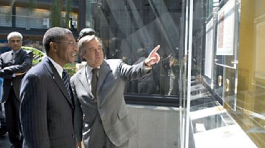 High Commissioner Guterres and Lesotho Prime Minister Mosisili look at UNHCR's Nobel Peace Prize medals.