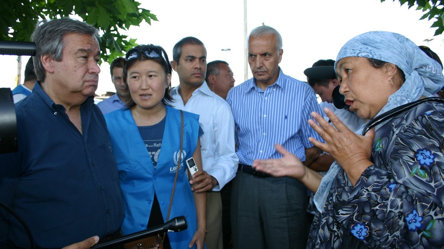 UN High Commissioner for Refugees António Guterres talks to returned refugees and IDPs in Jalalabad, southern Kyrgyzstan.