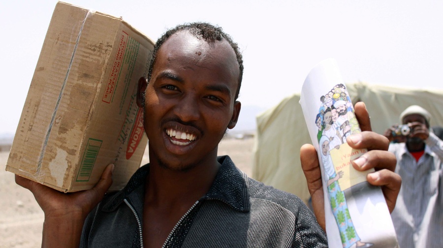 ADEN, Yemen, September 3 (UNHCR) - UNHCR staff have helped distribute pasta, sugar and dates to thousands of mainly Somali refugees in Yemen's Kharaz Camp thanks to the generosity of the Red Crescent Society of the United Arab Emirates and the president of the Gulf federation.