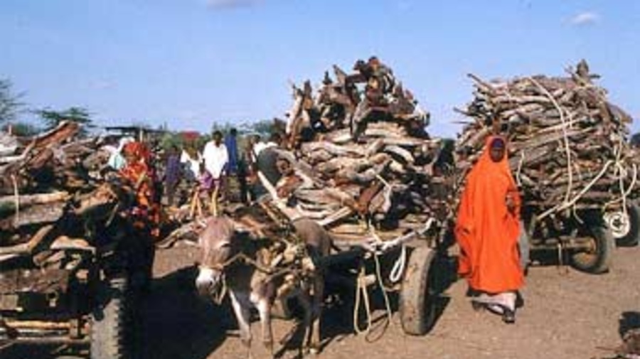 Firewood distribution at Kenya's Dadaab camp. UNHCR is trying to reduce refugee reliance on firewood through a trial run of solar cookers in the camp.