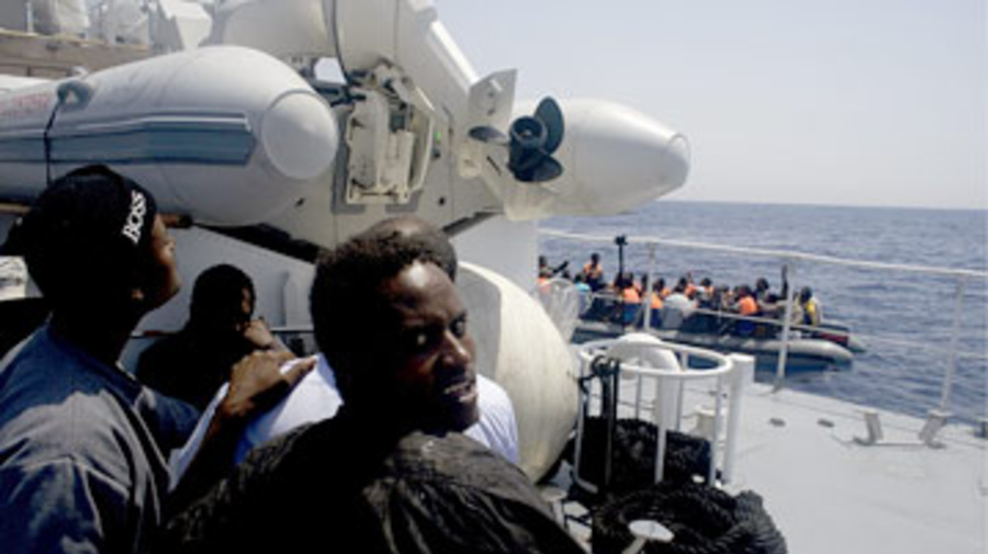 An Italian Coastguard vessel picks up boat people off the island of Lampedusa. UNHCR is holding a meeting on how to help refugees moving along migration routes in a search for safety.