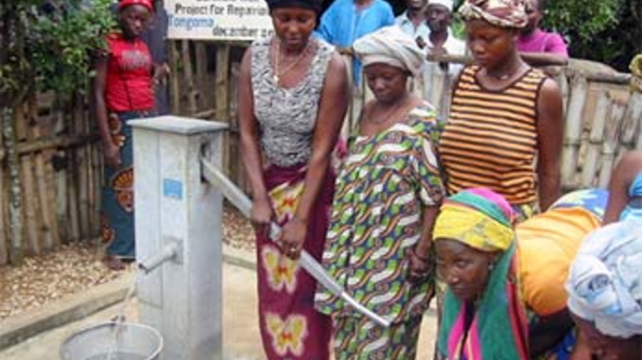 Returnee women fetching water from their new pump well in Tongoma village, Kono district, Sierra Leone.