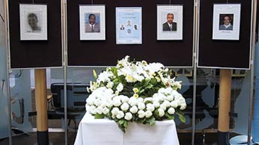 Two years after the murder of UNHCR workers in Atambua and Macenta, High Commissioner Ruud Lubbers places a wreath at a memorial at the UN refugee agency's headquarters in Geneva to commemorate staff who have died in the line of duty.