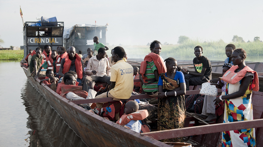 South Sudanese Refugees head down the Baro River in western Ethiopia on their journey by boat and vehicle to the Pugnido Refugee Camp. They had been stuck at Matar Way Station since August because of flooding.