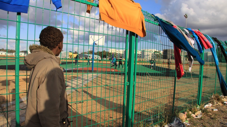 A 12-year-old unaccompanied minor watches a game of football at a site for Somalis and Eritreans in Tripoli. He wants to go to Europe to get an education.
