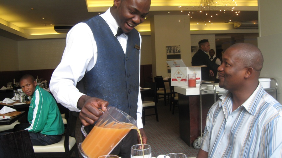 Langton Sanyanga shows off his new skills at the Cape Town hotel where he now works.