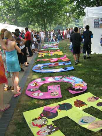 Passers-by admiring the letters, decorated by children, that formed the words "Respect Refugees" during Celebrating Sanctuary.