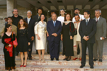Artists of the "Colours of Albania in the world" exhibition with Albanian Prime Minister Fatos Nano (centre, with blue tie) in Tirana. © B.Fusha