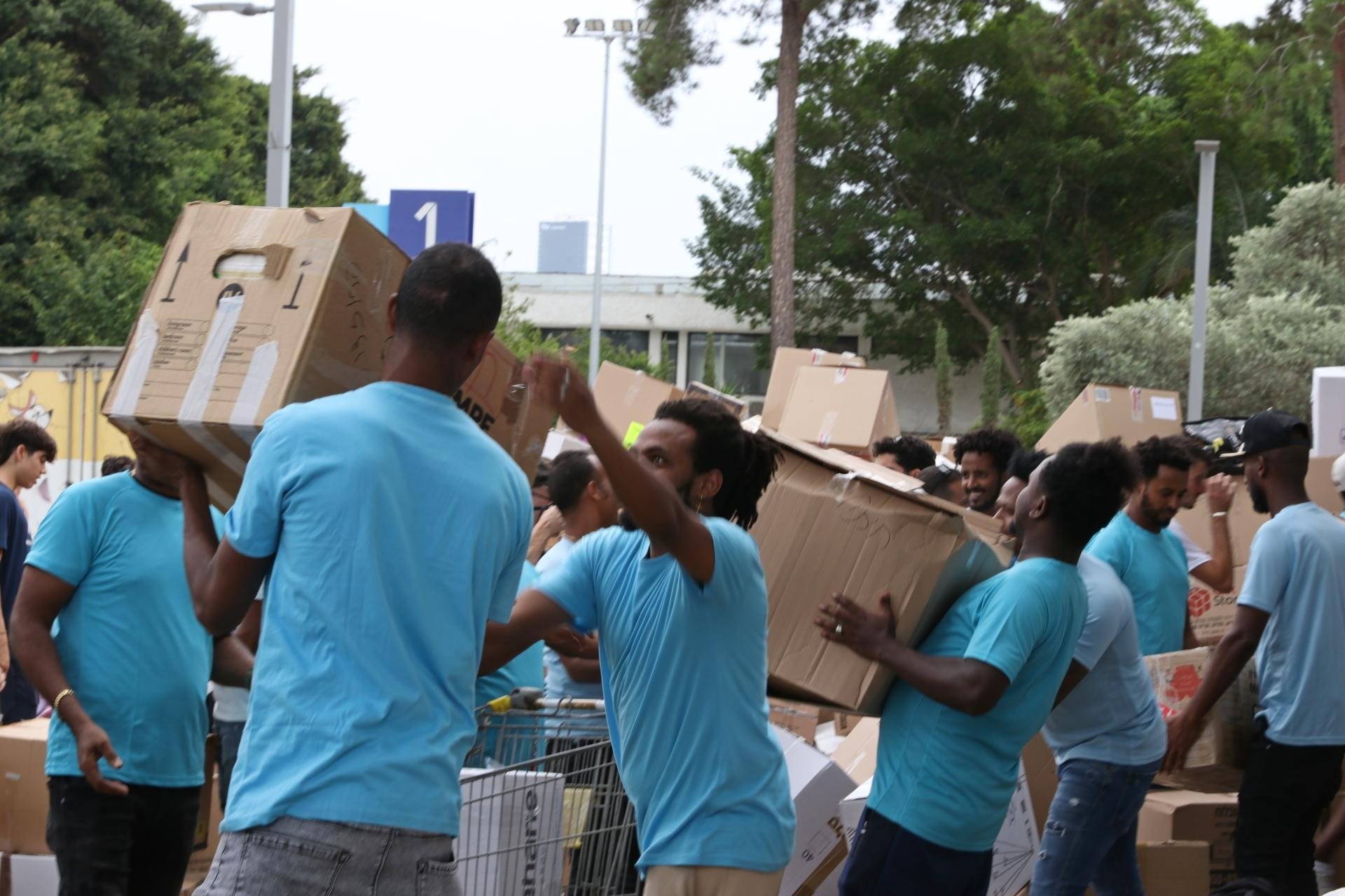 בתיווך נציבות האו"ם לפליטים, ההתארגנות האזרחית שהייתה מהירה ויעילה, אימצה בשמחה את היד המושטת לעזרה של הקהילה. בימים הראשונים למלחמה וכל השבועיים הראשונים, הגיעו מאות מתנדבים מהקהילה האריתראית לבושים בחולצות הטישרט הכחולות שהפכו לסימן מזהה, ועמלו במרץ על סחיבה ואריזת חבילות, ארגון וסידור תרומות, הכנת אוכל. בימים אלו, התרחב הסיוע, ועשרות אריתראים פועלים בהתנדבות גם בענף החקלאות הצמא לעובדים מיומנים. כך, בשעתה הקשה ביותר של המדינה, הפכו מבקשי המקלט לחולייה בלתי נפרדת בשרשרת המתנדבים האזרחית, והישראלים לא נשארו אדישים.