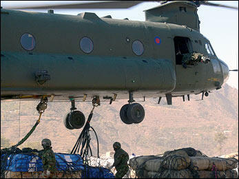 A British Chinook helicopter taking UNHCR relief items to the Leepa Valley in Pakistan-administered Kashmir.
