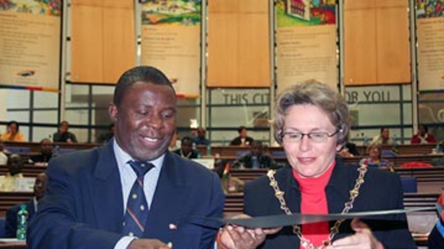 Cape Town's Mayor Helen Zille and UNHCR Deputy Regional Representative Abel Mbilinyi sign a Declaration of Refugees' Rights that guarantees to uphold the rights of refugees and support their integration into local society.