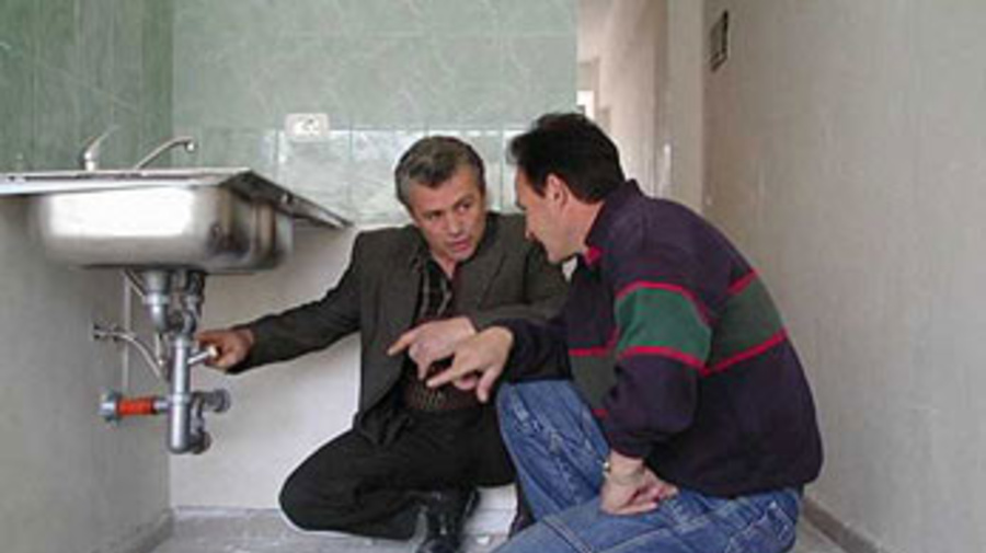 Abedin (right), an asylum seeker from Kosovo, getting professional tips on plumbing in Tirana.