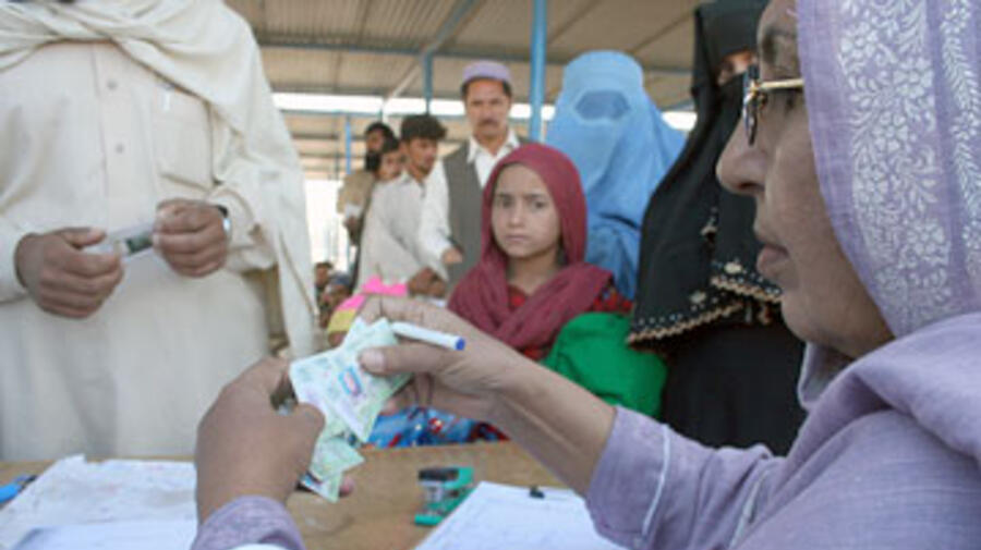 UNHCR staff checking Proof of Registration cards to verify the identity of registered Afghans before they return home from Pakistan.