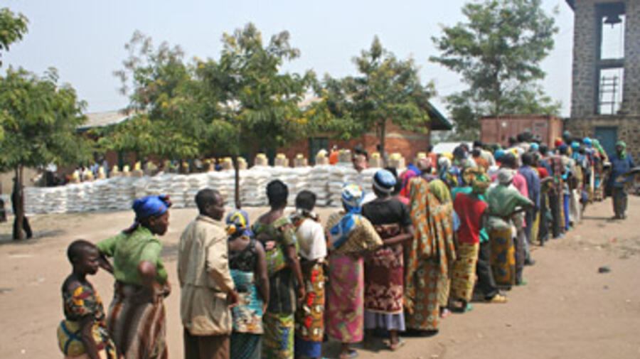 Displaced people queue up for assistance at the church in Kiwanja, North Kivu.