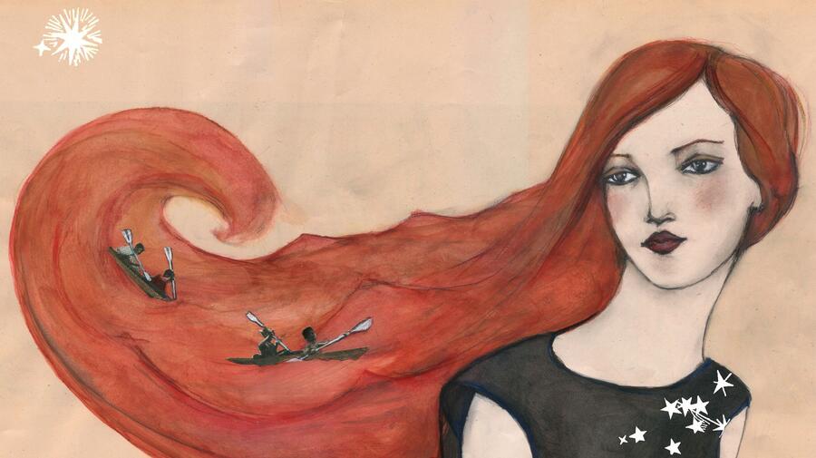 It's a crouched, barefoot woman in an oversized man's blazer, making her look like a bird. There's a city on fire in her smoky hair. The thinking is that we are each our home and that, if circumstances are difficult, we need to fly. To leave things behind.