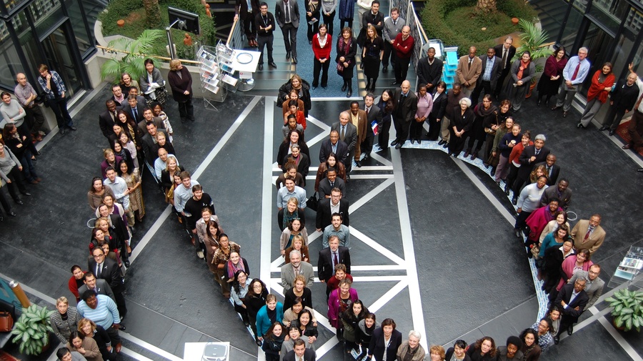 UNHCR staff gather in the atrium of the headquarters building to spell out "No" at the start of the 16 Days of Activism.