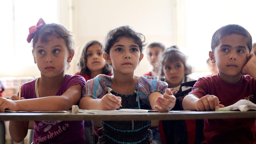 Syrian refugee children attend a class in the Bekaa Valley, Lebanon. UNHCR chief António Guterres says humanitarian crises, like the conflict in Syria and Typhoon Haiyan in the Philippines, disproportionately affect children and adolescents and make them vulnerable.