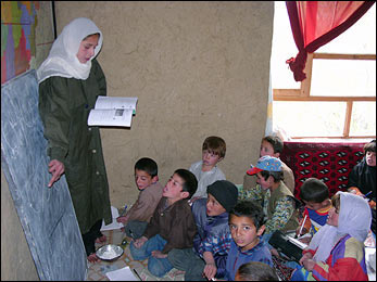 KHAN BAIHI, Afghanistan, July 4 (UNHCR) - A jumble of small plastic sandals covers the landing in front of the narrow mud-walled room. The boisterous sound of schoolchildren fills the space as they shout out the letters their teacher points to on the blackboard.