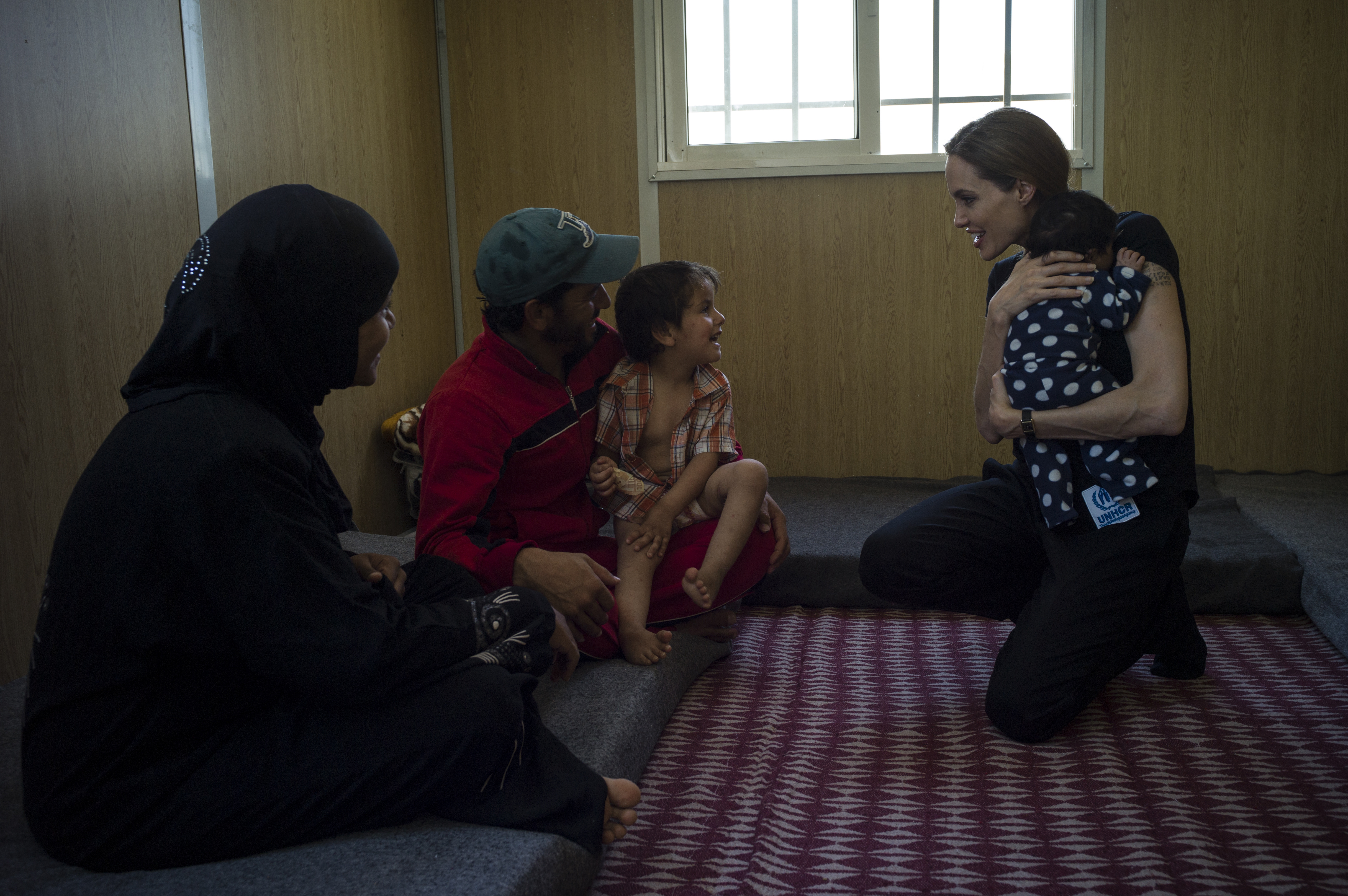 UNHCR Special Envoy Angelina Jolie speaks with a family of Syrian refugees in the Za'atri refugee camp in Jordan. One of the children was wounded in the leg by an explosion in Syria and had to be operated on in the camp.