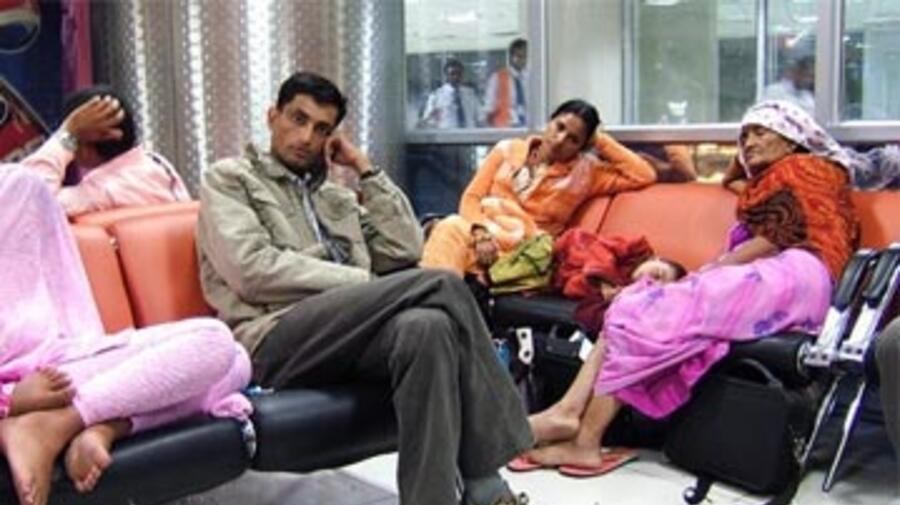 Refugees originating from Bhutan wait at Kathmandu airport for their flight to New Delhi en route to resettlement.