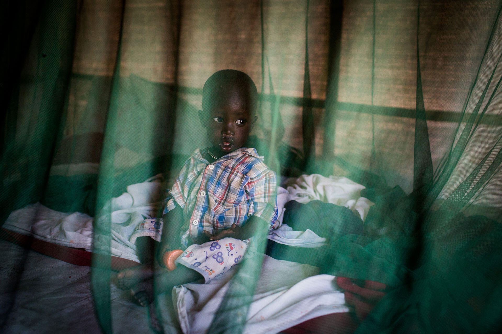 Boat, 11 months old, sits under a mosquito net in his family's shelter in Mingkaman, South Sudan. He was born on a ferry as his parents fled fighting near their village.