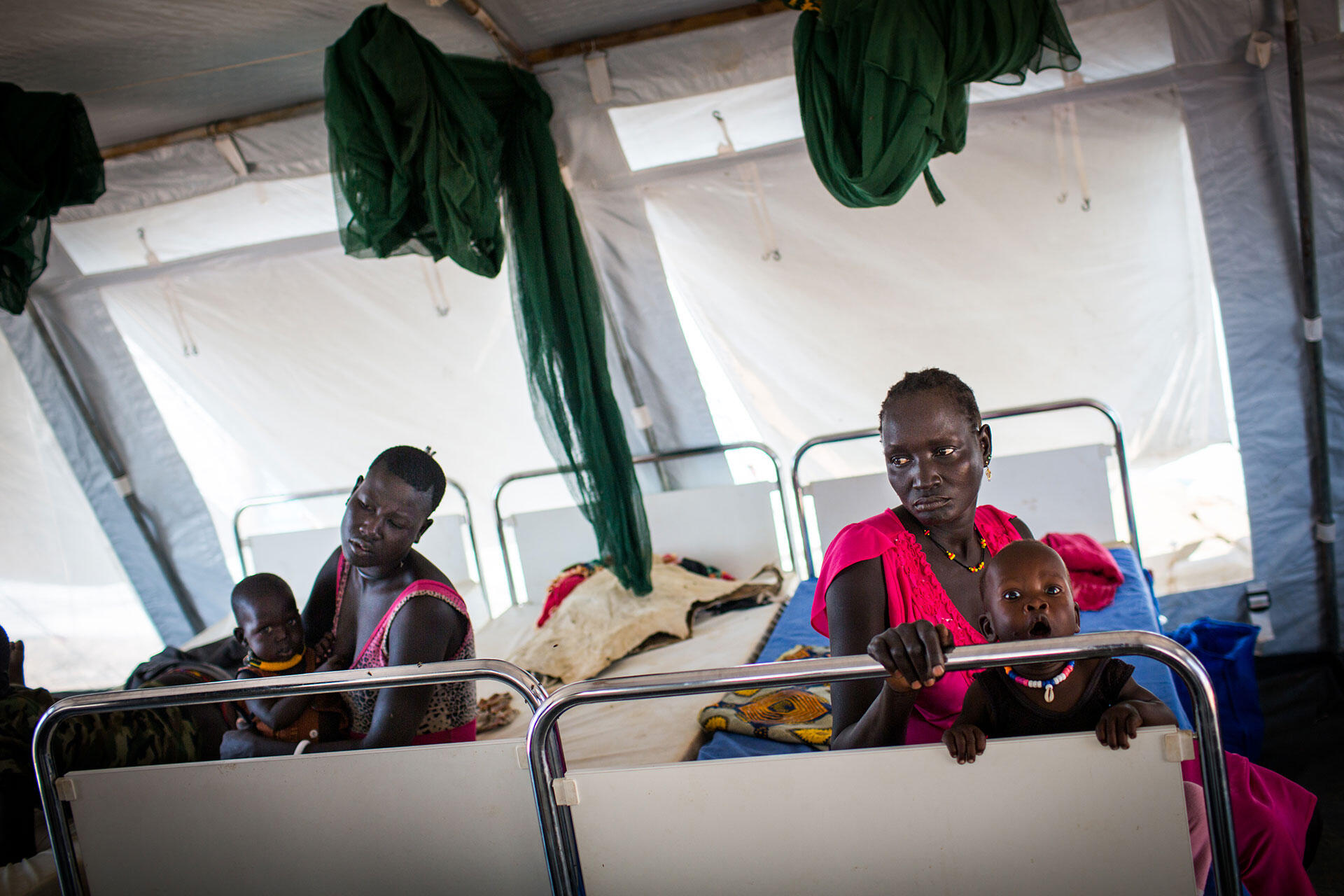 Mothers sit with their ailing children in a makeshift hospital in Mingkaman, South Sudan. The facilities are far better than back home, where war has destroyed many health clinics.