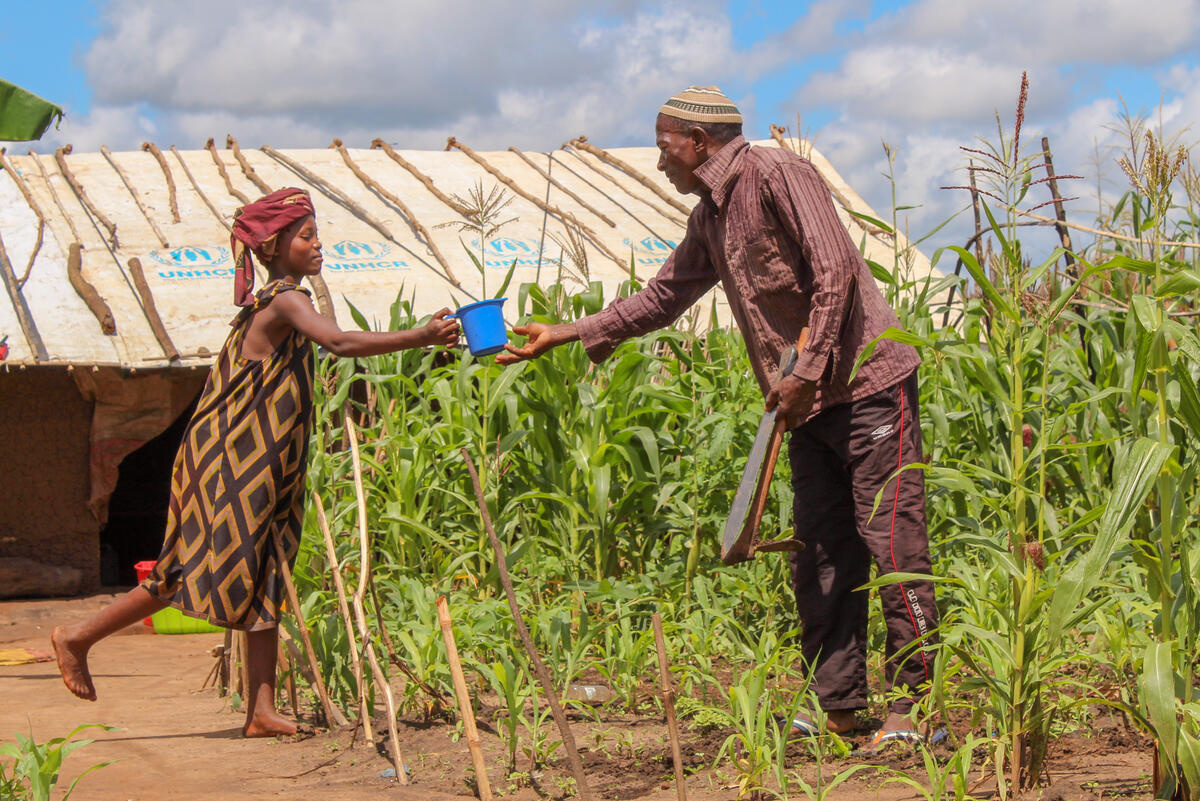 Next to their shelter in Nanjua B, Herculano has planted a small garden growing maize and sesame to help feed his family.