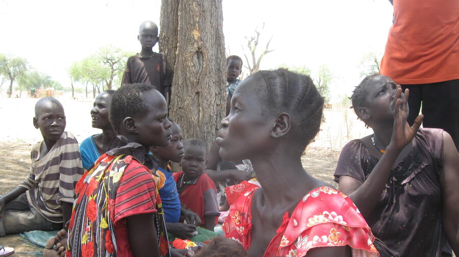 Displaced women and children under a hot sun in South Sudan's Maban County, where food shortages are causing tension.