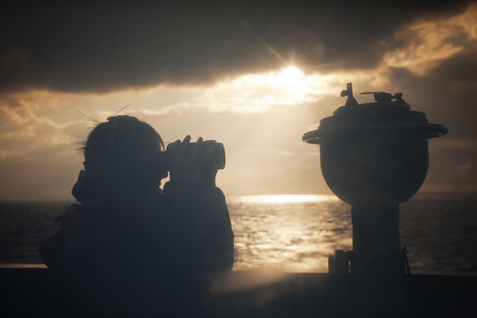 On another day, the rescue frigate Grecale located a small wooden boat off the coast after someone on board had contacted the Italian Red Cross. A skiff was launched, the crew armed with the boat's coordinates, and soon discovered 219 people packed on board a tiny blue-and-white boat.
